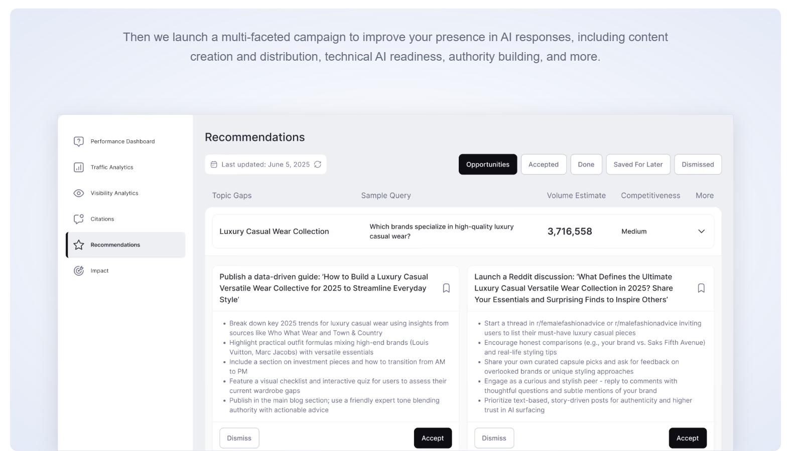 - 📊 Analytics Dashboard: Developed real-time tracking and reporting system for content performance across multiple AI platforms.